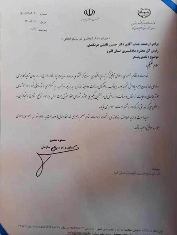 در انتهای این دیدار لوح تقدیر و تشکر دکتر مسعود منصور معاون وزیر جهاد کشاورزی و رئیس سازمان جنگل ها،مراتع و آبخیزداری کشور بخاطر حمایت های مستمر و قاطعانه رئیس کل دادگستری استان البرز از مجموعه منابع طبیعی، توسط مدیر کل منابع طبیعی البرز به وی اهدا گردید.