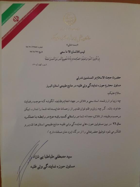 مسئول حوزه نمایندگی ولی فقیه مستقر در اداره کل منابع طبیعی و آبخیزداری البرز در بین سایر مسئولین حوزه های استان ها رتبه دوم را کسب نمود