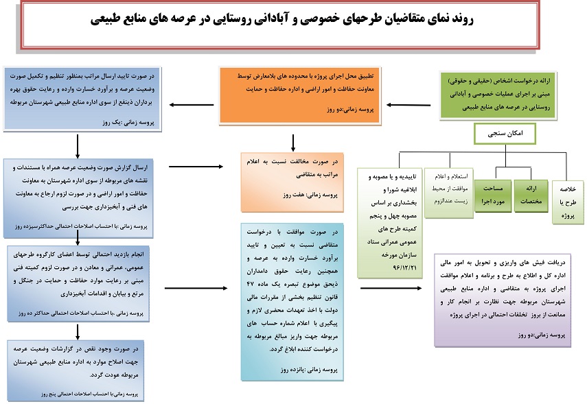 به گزارش پایگاه اطلاع رسانی اداره کل منابع طبیعی و آبخیزداری استان البرز؛ سعید ناطقیان رئیس اداره حفاظت و حمایت اداره کل منابع طبیعی استان البرز، تصریح نمود: بمنظور تسهیل و تسریع در روند پیگیری امور متقاضیان طرح های عمومی، عمرانی، ملی و نیز آبادانی روستایی در عرصه های منابع طبیعی با استناد به دستورالعمل های سازمانی موضوع بند ب ماده 12 قانون افزایش بهره وری بخش کشاورزی و منابع طبیعی مبادرت به تنظیم روندنمای زمانی و ارائه آن از طریق میز خدمت به مراجعه کنندگان گردیده است.