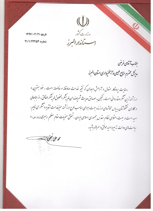 به گزارش پایگاه اطلاع رسانی اداره کل منابع طبیعی و آبخیزداری استان البرز؛ به نقل از ایرنا؛ حامد فرضی، مدیرکل منابع طبیعی البرز به پاس خدمات ارزنده در اجرای طرح میز خدمت، تکریم ارباب رجوع، اهتمام به موضوع و پیگیری امور تا حصول نتیجه از سوی استاندار استان لوح سپاس دریافت نمود.
