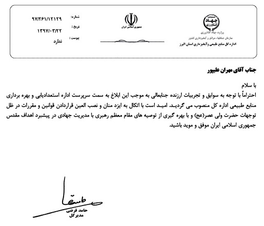 سرپرست اداره استعدادیابی و بهره برداری منابع طبیعی اداره کل منابع طبیعی و آبخیزداری استان البرز معرفی شد
