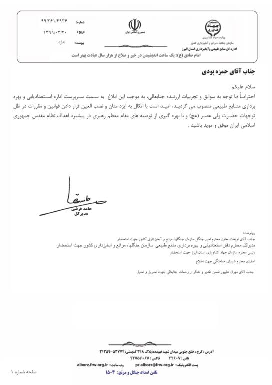 به گزارش پایگاه اطلاع رسانی اداره کل منابع طبیعی و آبخیزداری استان البرز؛ طی حکمی از سوی دکتر حامدفرضی مدیر کل منابع طبیعی و آبخیزداری استان، حمزه پودی به عنوان سرپرست اداره استعداد یابی و بهره برداری منصوب و از زحمات آقای علیپور؛ رئیس سابق این اداره تقدیر بعمل آمد. بر اساس این گزارش، حمزه پودی پیش از این دارای سوابق متعددی در استانها از جمله مسئولیت کارشناس امور جنگل در معاونت جنگل سازمان جنگلها بر عهده داشت.