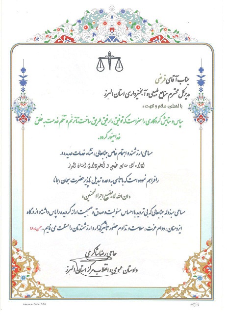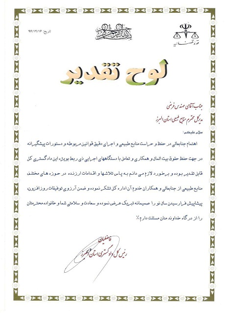 به گزارش پایگاه اطلاع رسانی اداره کل منابع طبیعی و آبخیزداری استان البرز؛ با توجه به تلاشهای بی وقفه در حفظ و حراست از منابع طبیعی و اجرای دقیق قوانین مربوطه و دستورات پیشگیرانه در جهت حفظ حقوق بیت المال و همکاری و تعامل با دستگاه های اجرایی ذیربط؛ مدیرکل منابع طبیعی و آبخیزداری البرز؛ به عنوان دستگاه برتر؛ مفتخر به دریافت لوح سپاس از سوی رئیس کل دادگستری و دادستان عمومی و انقلاب مرکز استان البرز شد.