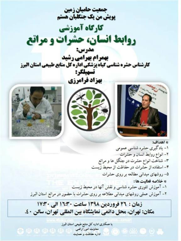 وی افزود: در این راستا در اولين گام، اداره كل منابع طبيعي البرز با همكاري پويش مردمي "من يك جنگلبان هستم" در سومين روز از نمايشگاه بين المللي محيط زيست تهران در روز دوشنبه بیست و ششم فروردین ماه سالجاری، نسبت به برگزاری كارگاهي تئوري با نام " روابط انسان، حشرات و مراتع" توسط مهندس بهمرام بهرامی رشید کارشناس گیاه پزشکی این اداره کل اقدام نمود.