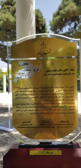 در پایان این مراسم از رئیس کل دادگستری، مدیر کل منابع طبیعی و آبخیزداری، مدیر کل ثبت اسناد و املاک استان و تمامی عوامل به پایان رسیدن طرح کاداستر اراضی ملی البرز بابت زحمات ایشان، با اهدای تندیس و لوح، تقدیر و تشکر بعمل آمد.
