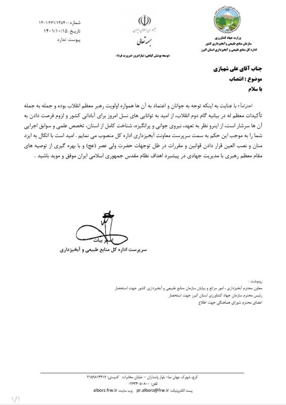 به گزارش پایگاه اطلاع رسانی اداره کل منابع طبیعی و آبخیزداری استان البرز، روز پنج شنبه پانزدهم دی ماه سالجاری طی حکمی از سوی اصغر بیات سرپرست اداره کل منابع طبیعی و آبخیزداری استان البرز، آقای علی شهبازی به عنوان سرپرست معاونت آبخیزداری اداره کل منابع طبیعی و آبخیزداری استان البرز منصوب گردید.