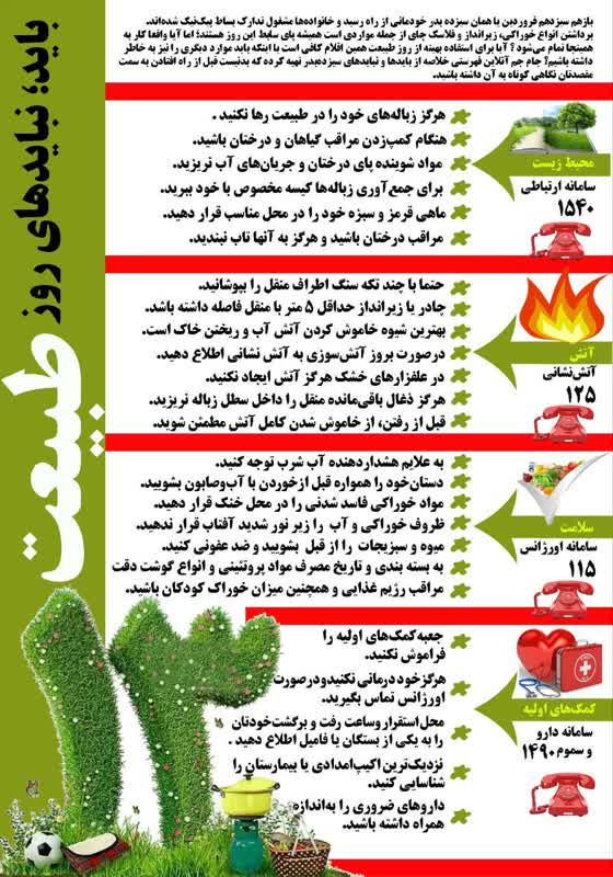 به گزارش پايگاه اطلاع رساني اداره كل منابع طبيعي و آبيزداري استان البرز به نقل از خبرگزاري ايرنا، اصغر بیات روز شنبه در گفت وگو با خبرنگار ایرنا افزود: مردم استان در تفرجهای روز طبیعت، علاوه بر توجه به توصیه های کارشناسان، به استفاده صحیح و مراقبت از طبیعت توجه لازم و کافی داشته باشند و در حد امکان از اتراق در نزدیکی رودخانه ها بپرهیزند.